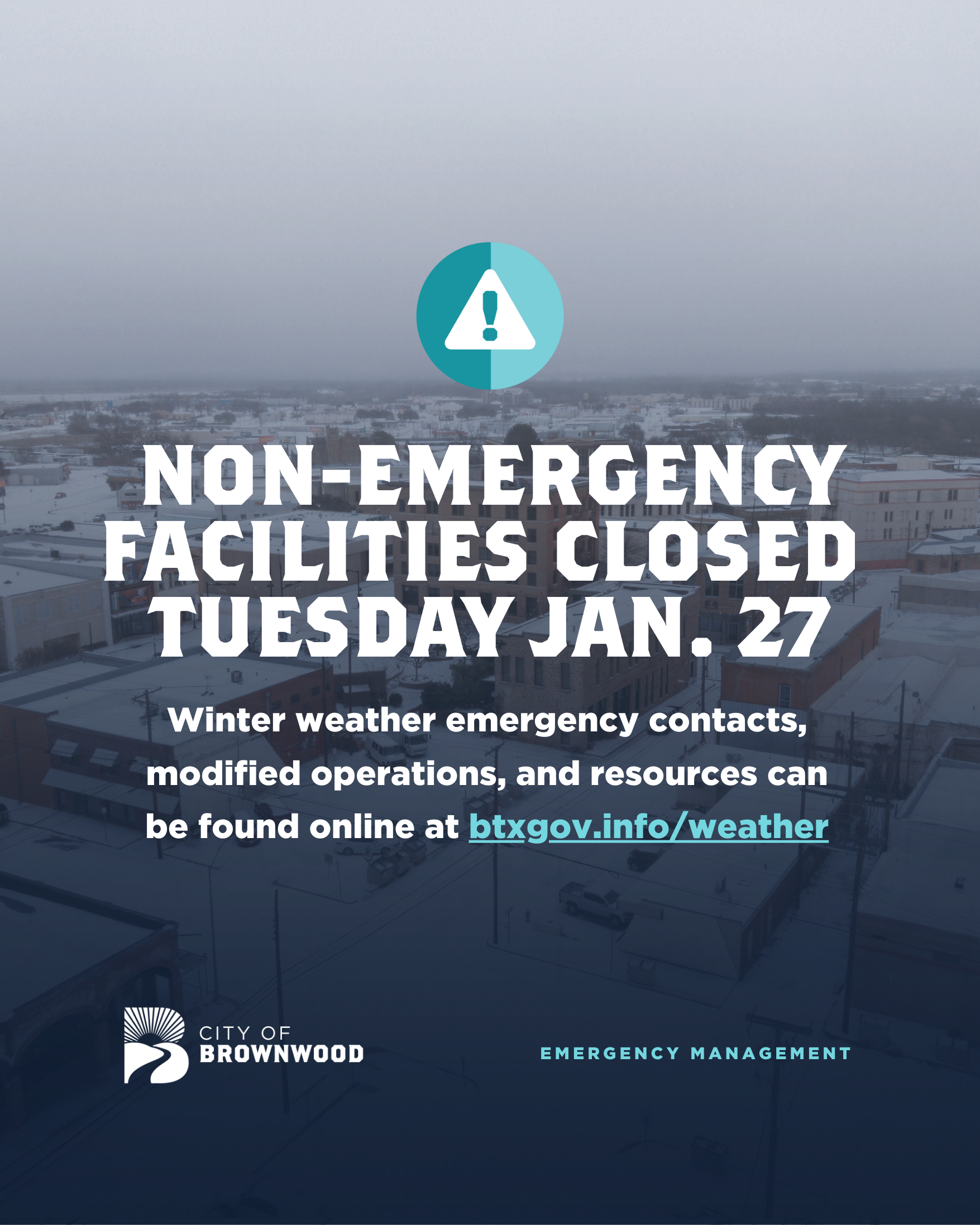 Due to continued freezing temperatures and road conditions the City of Brownwood will be adapting its hours of operation. The following adjustments are announced for Tuesday, January 27th.