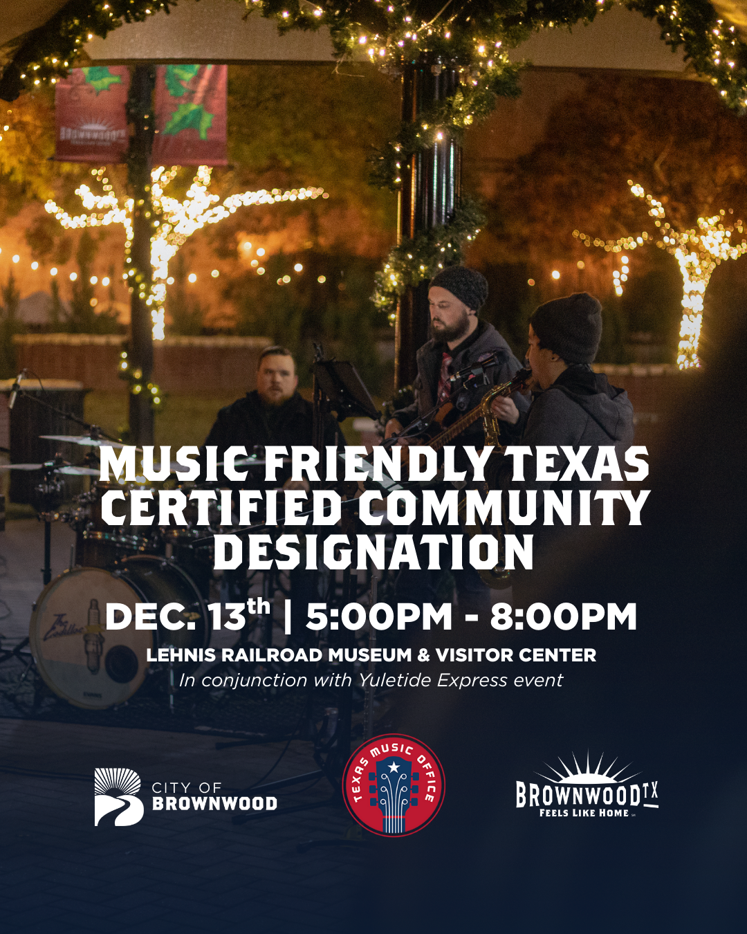 The City of Brownwood will receive its official designation as a Music Friendly Texas Certified Community by the Texas Music Office, Office of the Governor. Representatives from the Texas Music Office will present the certification during a ceremony on Saturday, December 13, held in conjunction with the Yuletide Express: A Vintage Christmas Journey event at the Lehnis Railroad Museum and Visitor Center. The celebration will take place from 5:00 PM to 8:00 PM, with the presentation and live music beginning promptly at 5:00 PM. The evening will include performances by student bands as well as the Cadillac Thieves.
