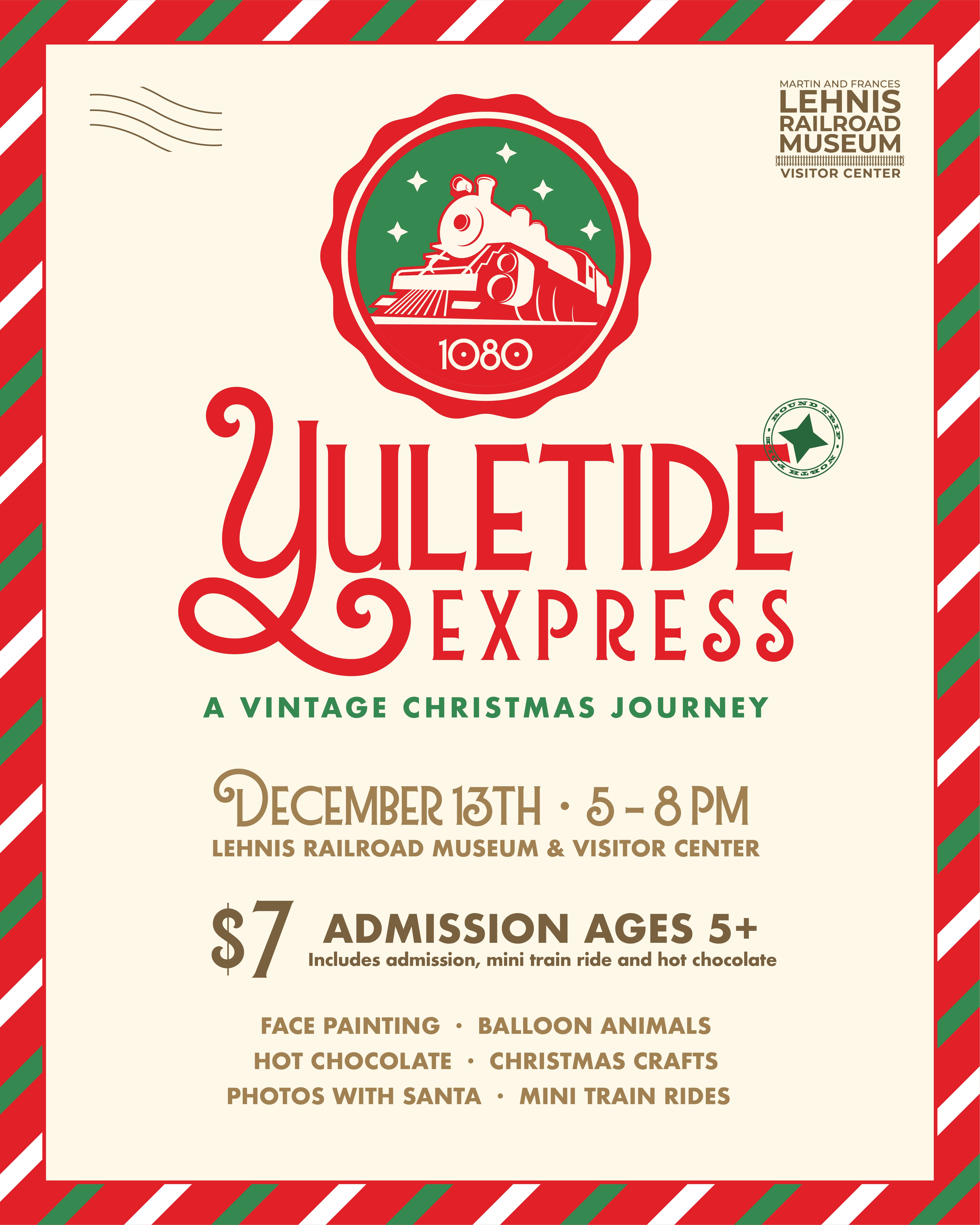 Admission is $7 for ages 5 and up and includes museum admission, one mini train ride, and hot chocolate. Active military members will receive free admission upon presenting a valid military ID at entry.